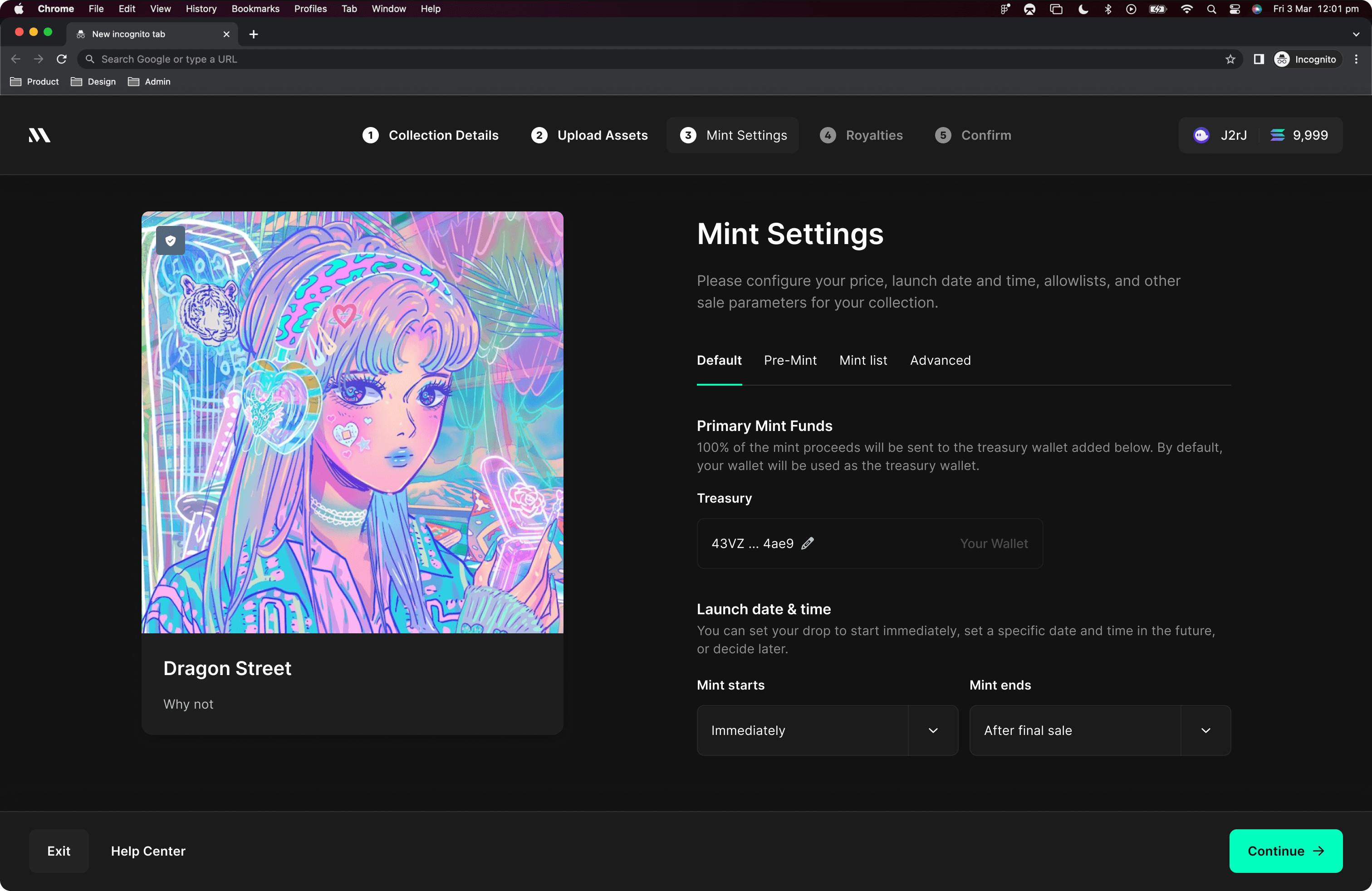 Step-by-step builder: Upload assets, define supply, pricing, mint schedule, and gating rules.